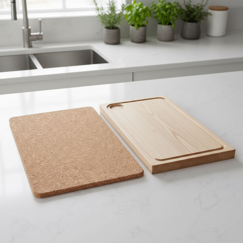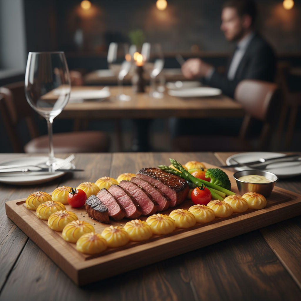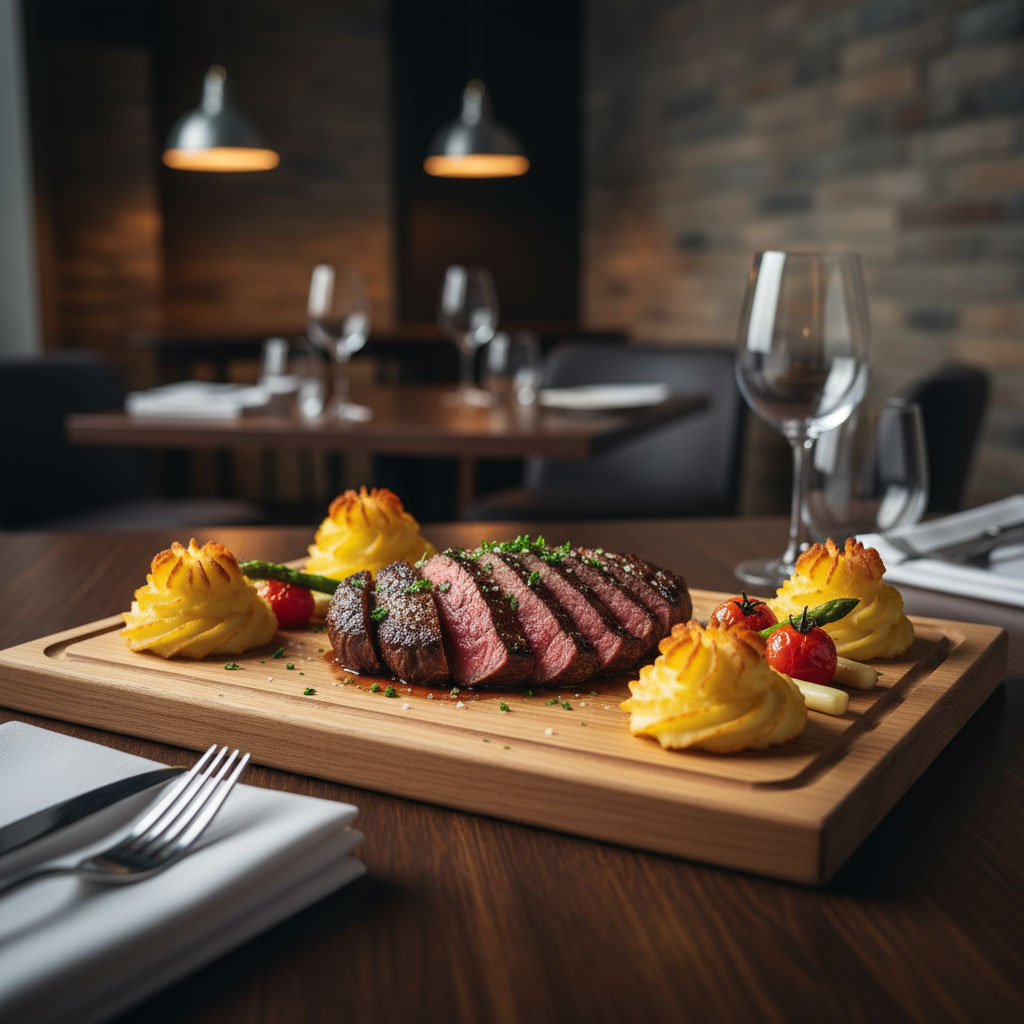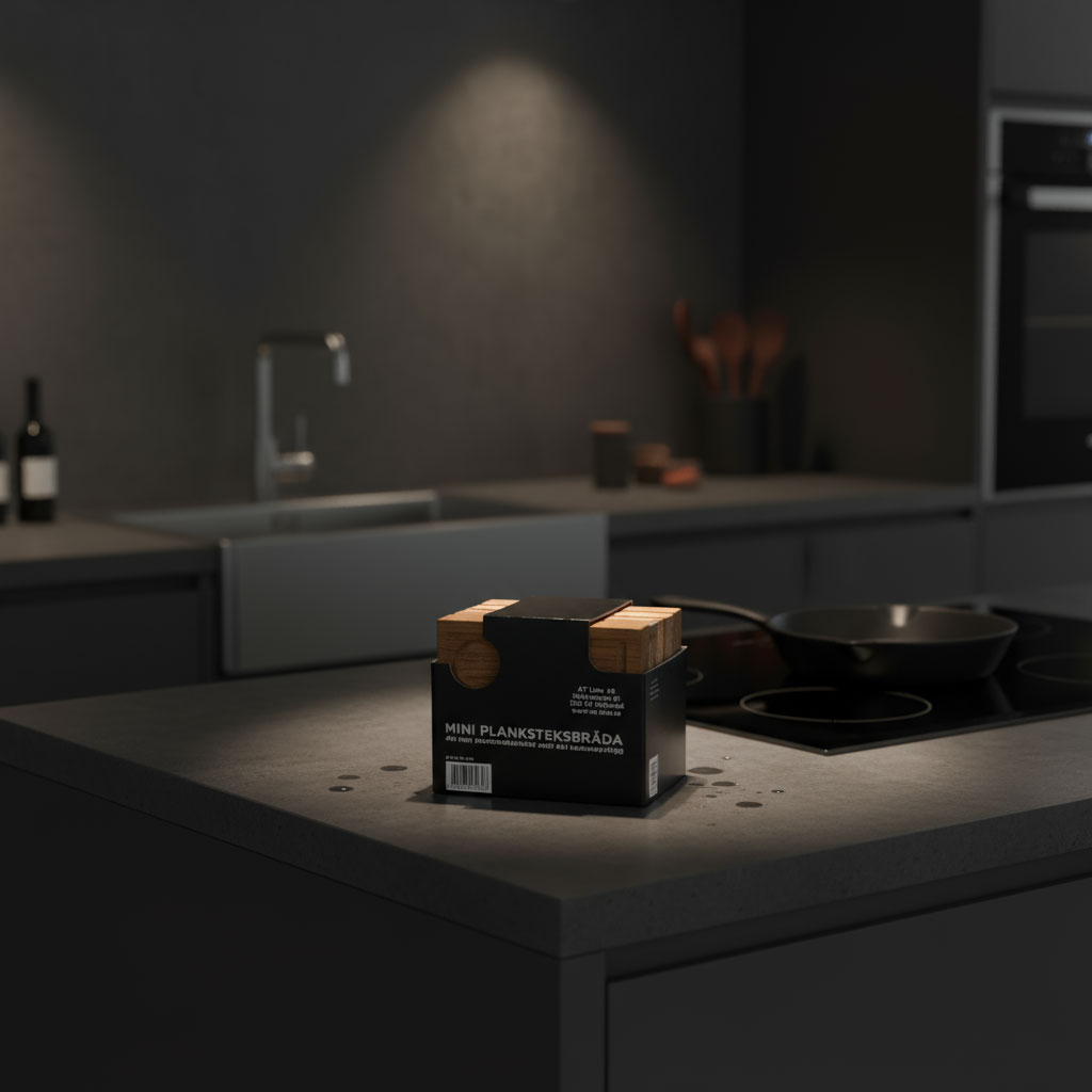 Dubbla planksteksbrädor med dubbla korkunderlägg i ek/kork. Spritsa potatismos runt om, lägg på önskade grönsaker och kött, stoppa i ugnen och servera. En fantastisk planksteksbräda i ek.