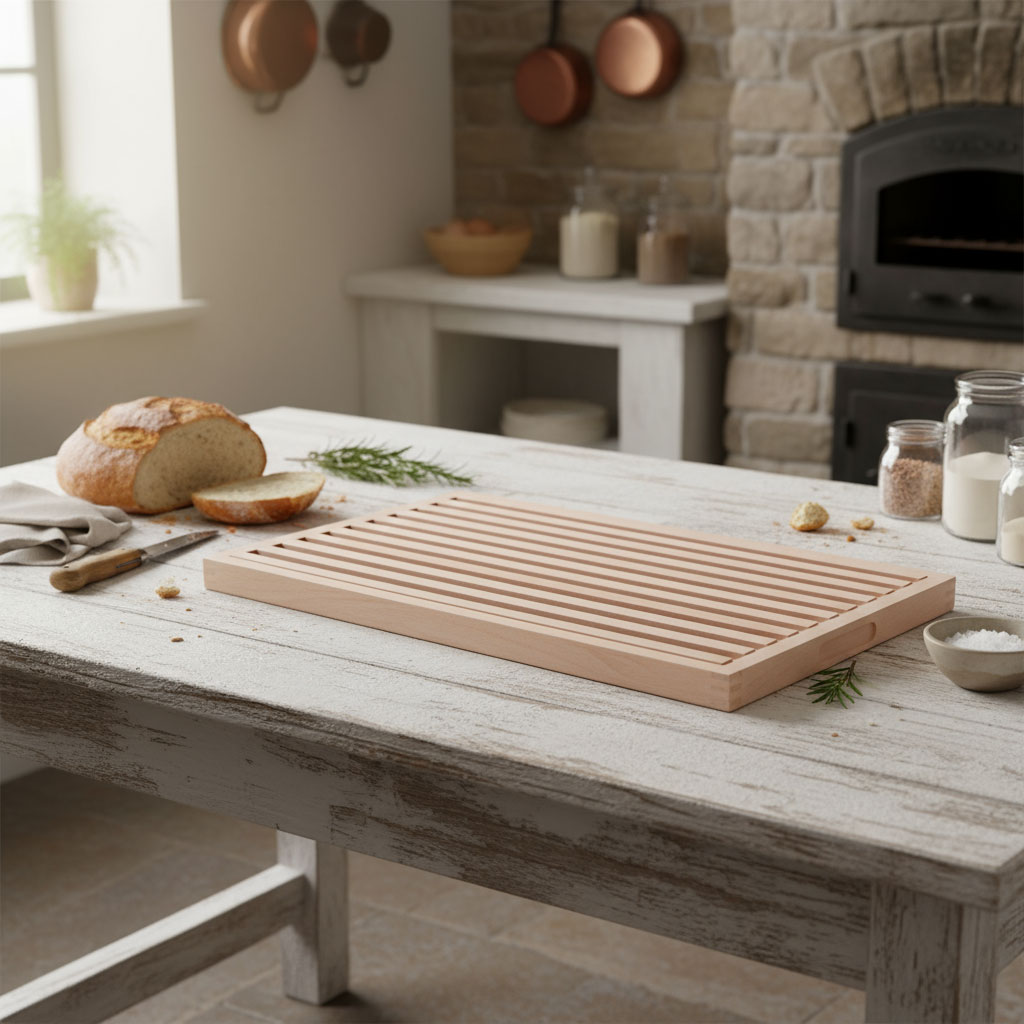 Denna skärbräda i massiv bok är både praktisk och vacker, särskilt framtagen för att hantera bröd på ett smart sätt. De längsgående spåren fångar upp smulor som annars hamnar på bord eller bänk, vilket gör den perfekt vid både frukost och servering. Bokträets ljusa färg och jämna ådring ger brädan ett stilrent uttryck som passar i alla typer av kök.
