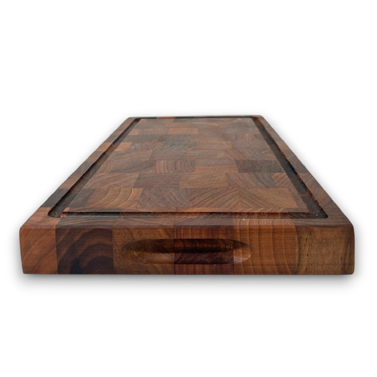 En exklusiv och hållbar skärbräda tillverkad i ändträ av valnöt. Ändträets unika struktur gör brädan extra skonsam mot knivens egg och bidrar till lång livslängd. Brädan är försedd med en praktisk ränna som fångar upp vätska samt greppvänliga handtag för enkel hantering. En perfekt kombination av funktion och elegans för både hemmakocken och det professionella köket.
